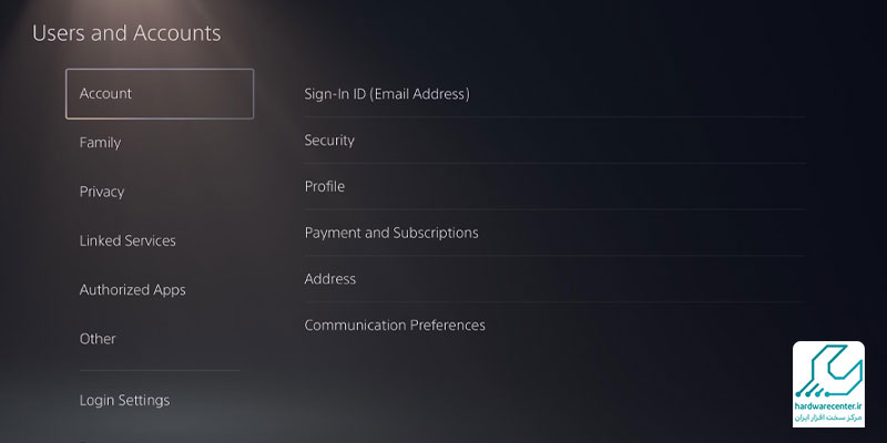 از صفحه اصلی پلی استیشن ۵ به بخش تنظیمات دستگاه مراجعه کنید، سپس در جهت پایین اسکرول نمایید و عبارت Users and Accounts را برگزینید.